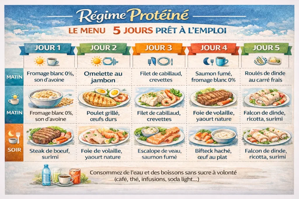 • Menu prêt : privilégier protéines pures et simplicité pour démarrer cinq jours sans hésitation ni complication et durablement au quotidien.